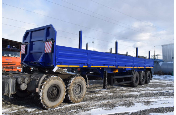 34500 кг, длина платформы 12260 мм, высота ССУ 1450 мм, рессорная подвеска HJ, 3 оси, шины 425/85R21 / 6+1, съемные борта 620 мм, раздвижные коники 1500 мм, усиленный передний щит, опции: задний усиленный щит, Ш-образные коники для НКТ трубы, буровых штанг, обрезинивание коников