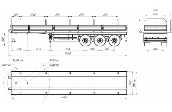 34500 кг, длина платформы 12260 мм, высота ССУ 1450 мм, рессорная подвеска HJ, 3 оси, шины 385/65R22,5 / 6+1, съемные борта 620 мм, раздвижные коники 1500 мм, усиленный передний щит, опции: задний усиленный щит, Ш-образные коники для НКТ трубы, буровых штанг, обрезинивание коников