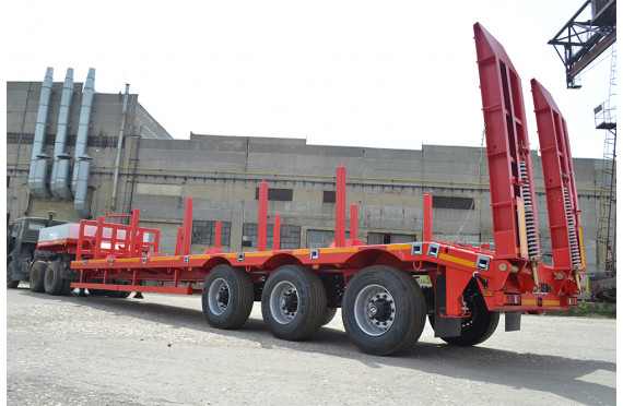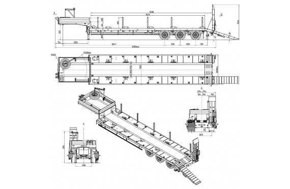 45200 кг, шины 395/85R20 или 445/65R22,5 / 6+1, платформа 12000 (12862 до трапов) x 2530 с уширителями до 3030 мм, ССУ 1550 мм, рессорная или пневматическая подвеска, съемные стойки, механические трапы с пружиной