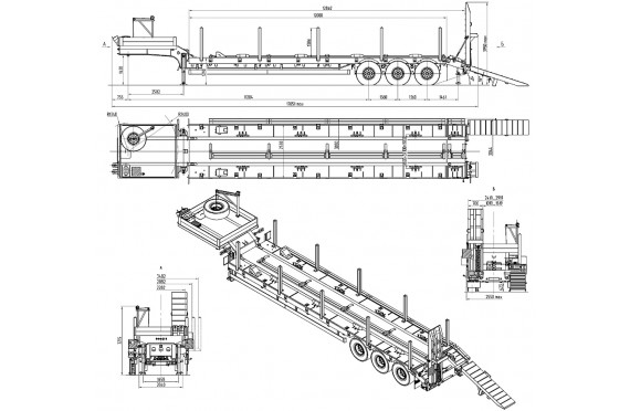 45200 кг, шины 395/85R20 или 445/65R22,5 / 6+1, платформа 12000 (12862 до трапов) x 2530 с уширителями до 3030 мм, ССУ 1550 мм, рессорная или пневматическая подвеска, съемные стойки, механические трапы с пружиной