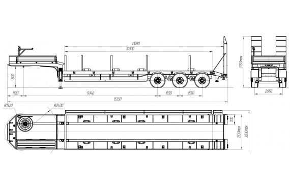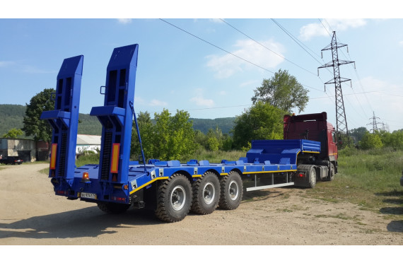 45000 кг, шины 445/65R22,5 или 395/85R20 / 6+1, платформа 10300 (11080 до трапов) x 2500 с уширителями до 3000 мм, механические трапы, ССУ 1510 мм, рессорная подвеска, съемные стойки 1500 мм