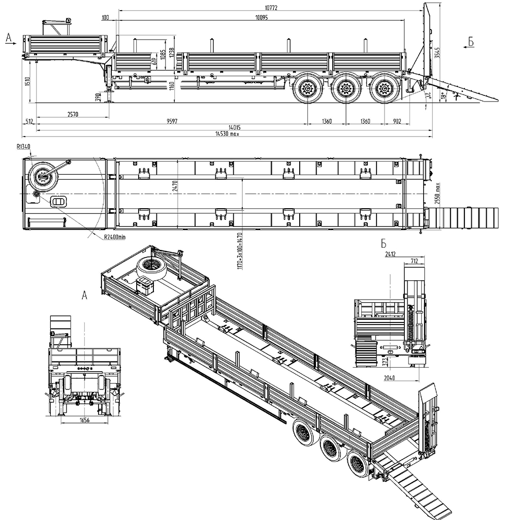 36000 кг, шины 385/65R22,5 или 445/65R22,5/ 6+1, платформа без трапов (12200 x 2500 мм, ССУ 1430 ммпневматическая подвеска, раздвижные коники 1500 мм, съемные борта или без них, в ГАБАРИТЕ по ДЛИНЕ АВТОПОЕЗДА с КАМАЗ 6x6