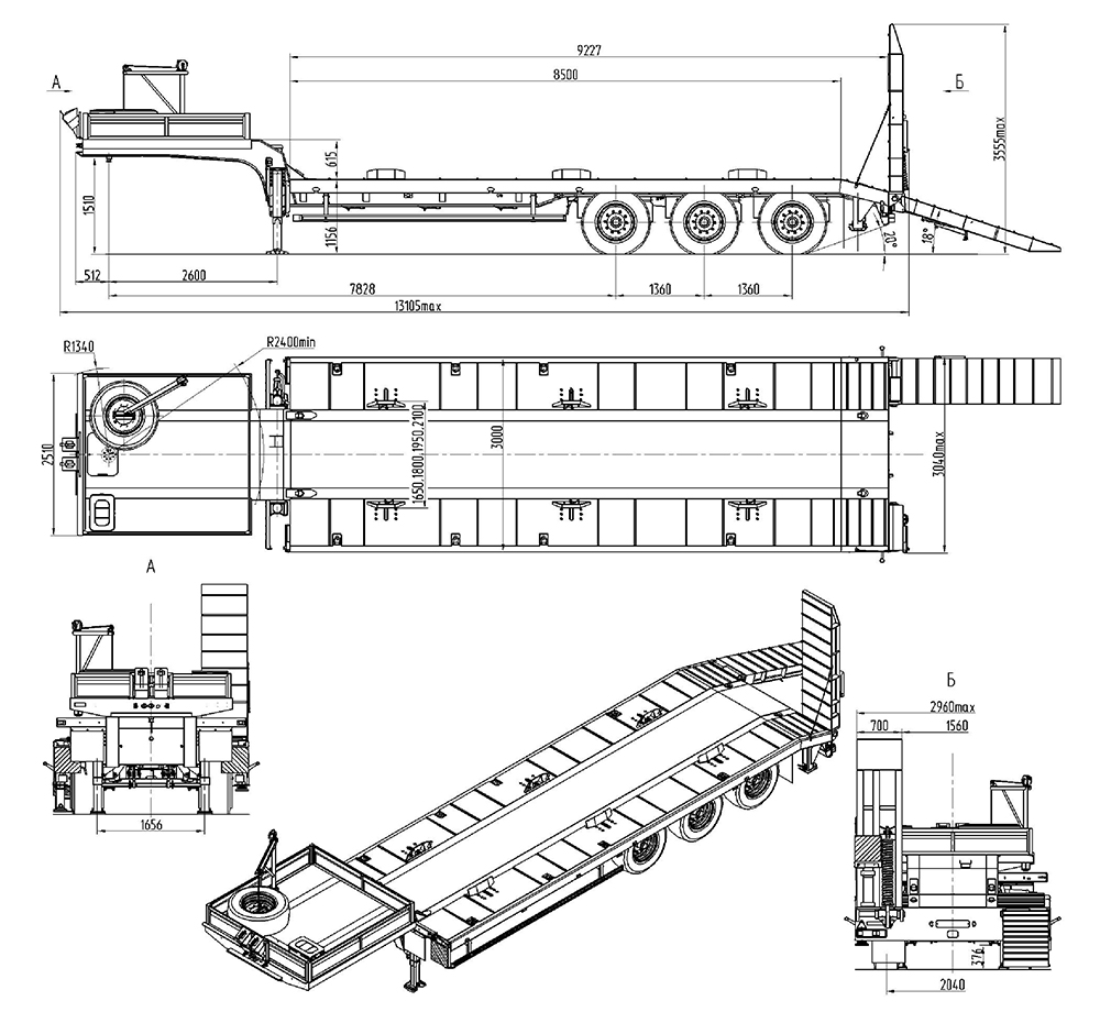 33500 кг, шины 385/65R22,5/6+1, платформа 8500 (9227 до трапов) x 2530 с уширителями до 3030 мм, ССУ 1510 мм, рессорная или пневматическая подвеска, съемные стойки